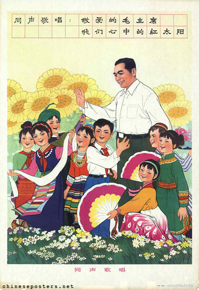 同声歌唱 Tongsheng gechang Designer Li Mingmei (李明媚) Sun Jinghui (孙敬会) Date 1978, November Publisher Renmin meishu chubanshe (人民美术出版社), Beijing Size 77x53 cm. Call nr. BG E12/115 Collection IISH collection Notes Zhou Enlai and children singing Beloved Chairman Mao, the Red Sun in Our Hearts (敬愛的毛主席 我们心中的红太阳). Theme Zhou Enlai Link to IISH catalog https://search.iisg.amsterdam/Record/901689