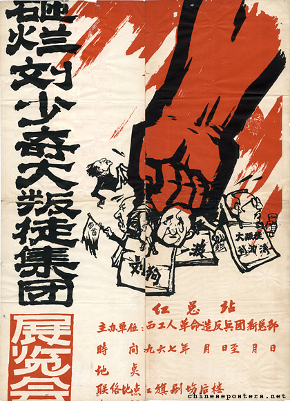 This poster was cut into four pieces with quite some loss of text and image, also at the top and bottom, and later reasssembled. Editorial information is missing. The exhibition was organized by the 西工人革命造反兵团新总部 - Western Workers' Revolutionary Rebel Corps New Headquarters - and held in the 联络地点红旗剧场后楼 - rear building of the Red Flag Theater. The location probably is Chengdu, Sichuan Province.