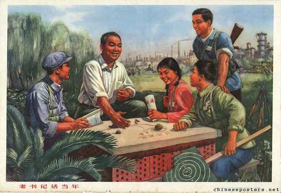 During a People's Militia training near an industrial plant, young workers listen to an older man, the Party secretary. He has drawn a map of the Liao-Shen or Liaoning-Shenyang Campaign (辽沈战役) during the final phase of the Civil War, September-November 1948. The big stone represents Changchun (長春), one of the smaller stones Shenyang (沈阳).