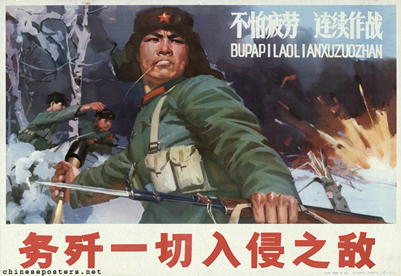 务歼一切入侵之敌 - 不怕疲劳连续作战 Wu jian yiqie ruqin zhi di - Bupa pilao lianxu zuozhan Designer Sun Yiqiang (孙谊强) Guo Fugen (郭福根) Gao Quan (高泉) Date 1975, September Publisher Tianjin renmin meishu chubanshe (天津人民美术出版社) Size 53x77 cm. Call nr. BG E39/339 Collection IISH collection Theme People's Liberation Army Link to IISH catalog https://search.iisg.amsterdam/Record/1285647