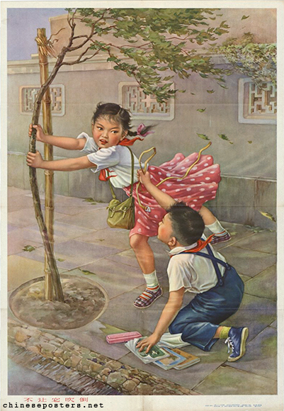 不让它吹倒 Bu rang ta chui dao Designer Shao Keping (邵克萍) Wu Zhefu (吴哲夫) Date 1973, June Publisher Shanghai renmin chubanshe (上海人民出版社) Size 77x53 cm. Call nr. BG E39/663 Collection IISH collection Notes Two schoolchildren (Pioneers) save a young tree. Link to IISH catalog https://search.iisg.amsterdam/Record/1287641
