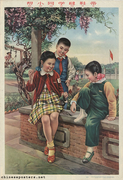 帮小同学缝鞋带 Bang xiao tongxue feng xiedai Designer Ying Yeping (应野平) Date 1959, September Publisher Shanghai renmin meishu chubanshe (上海人民美术出版社) Size 77x53 cm. Call nr. BG E39/684 Collection IISH collection Notes The title of the poster mentions "鞋带" - xiedai - shoelaces, but it looks more like the girl is mending her little classmate's 鞋底- xiedi - shoe sole?This is a print from the 11th impression (October 1963). Link to IISH catalog https://search.iisg.amsterdam/Record/1287758
