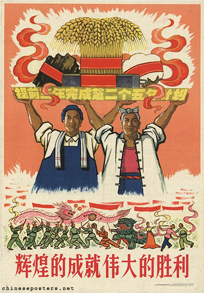 辉煌的成就伟大的胜利 Huihuang de chengjiu, weida de shengli Designer Central Academy of Arts and Crafts Decoration and Design Department (中央工艺美术学院装饰绘画系) Date 1960, January Publisher Renmin meishu chubanshe (人民美术出版社), Beijing Size 77x53 cm. Call nr. BG E39/733 Collection IISH collection Notes The text in the image is about the (alleged) completion of the Second Five-Year Plan three years ahead of schedule - 提前三年完成第二个五年计划. Theme First Five-Year Plan (1953-1957) Link to IISH catalog https://search.iisg.amsterdam/Record/1288006