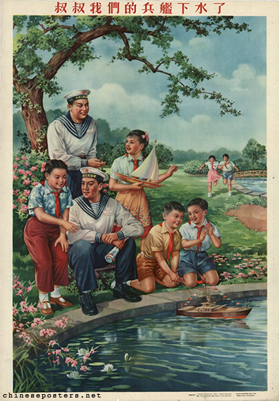 叔叔我們的兵艦下水了 Shushu women de bingjian xiashui le Designer Wu Zhefu (吴哲夫) Date 1954, November Publisher Shanghai huapian chubanshe (上海画片出版社) Size 77x53 cm. Call nr. BG E39/950 Collection IISH collection Theme The PLA and Children Link to IISH catalog https://search.iisg.amsterdam/Record/1289954