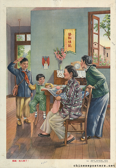 妈妈,我入队了! Mama, wo ru dui le! Designer Shao Qinyun (邵亲云) Date 1954, August Publisher Xin meishu chubanshe (新美术出版社), Shanghai Size 77x53 cm. Call nr. BG E39/959 Collection IISH collection Notes The boy has just joined the Pioneers. The banner reads 劳动模范 - model worker. The house resembles those in the newly built projects for (model) workers in Shanghai. Link to IISH catalog https://search.iisg.amsterdam/Record/1290002
