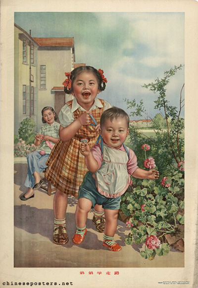 弟弟学走路 Didi xue zoulu Designer Li Mubai (李慕白) Date 1955, September Publisher Chaoyang meishu chubanshe (朝阳美术出版社), Shanghai Size 77x53 cm. Call nr. BG E39/980 Collection IISH collection Notes The setting resembles the newly built housing projects for model workers in Shanghai. Link to IISH catalog https://search.iisg.amsterdam/Record/1290098