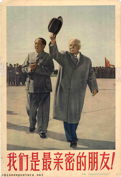 Mao meeting Kliment Voroshilov, Chairman of the Presidium of the Supreme Soviet of the Soviet Union, on Beijing Capital Airport, April 1957.