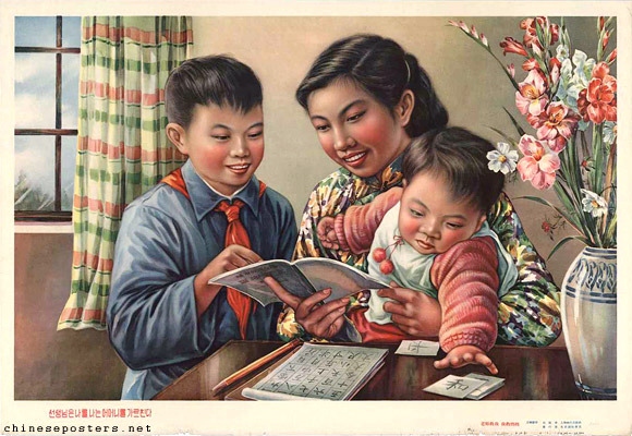 老师教我, 我教妈妈 Laoshi jiao wo, wo jiao mama Designer Wang Liuying (王柳影) Date 1956, November Publisher Shanghai huapian chubanshe (上海画片出版社) Size 53x77 cm. Call nr. BG E40/9 Collection IISH collection Notes The boy, a Pioneer, helps his mother learn to read and write.This is a print from the third impression, with the title also in Korean (bottom left). Theme Combat Illiteracy Campaigns (1950-1956) Link to IISH catalog https://search.iisg.amsterdam/Record/1290217